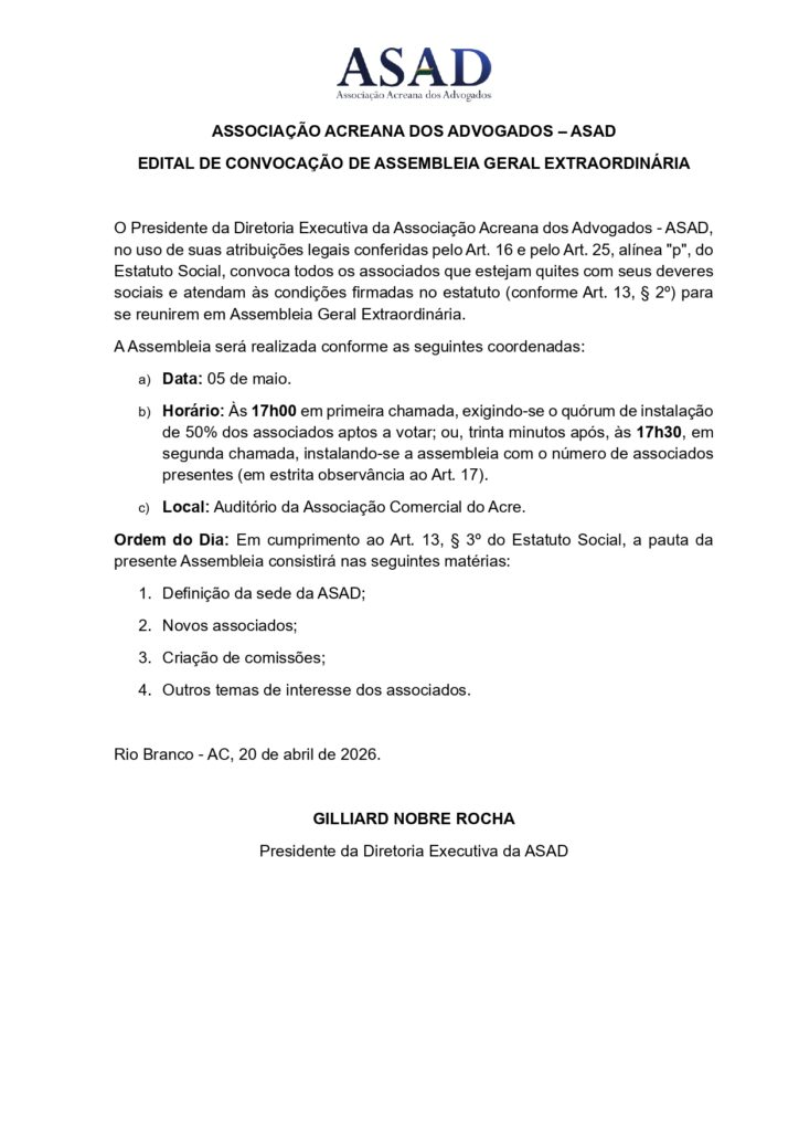 A Associação Acreana dos Advogados (ASAD) publicou edital convocando seus associados aptos a votar para participarem de Assembleia Geral Extraordinária. A reunião irá discutir temas institucionais importantes, como a definição da sede da entidade, admissão de novos membros e a criação de comissões.