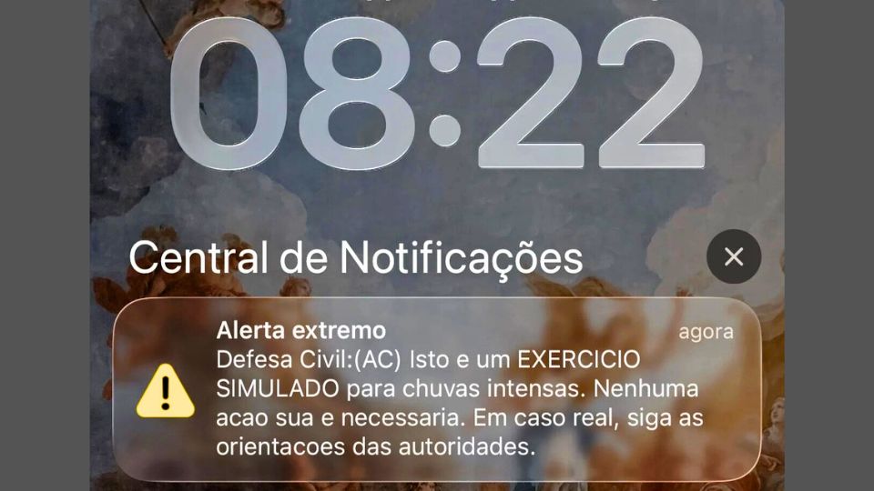 Um aviso sonoro inesperado interrompeu a rotina de moradores em todo o Acre na manhã deste sábado. Por volta das 8h20, celulares em diferentes municípios exibiram automaticamente uma notificação de alerta extremo enviada pela Defesa Civil do Estado, com destaque visual e sinal sonoro característicos do sistema de emergência.