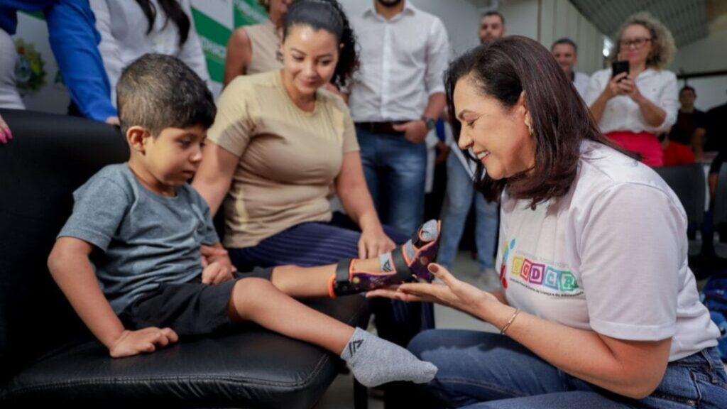 Elciane Fernandes, mãe de Elias, afirma que as órteses vão auxiliar a criança no tratamento: “Vai melhorar muito, porque vai ajudar a manter o pé dele no lugar, para não entortar e atrofiar mais”.